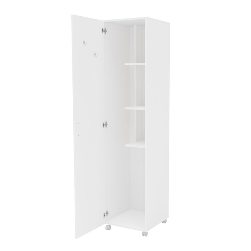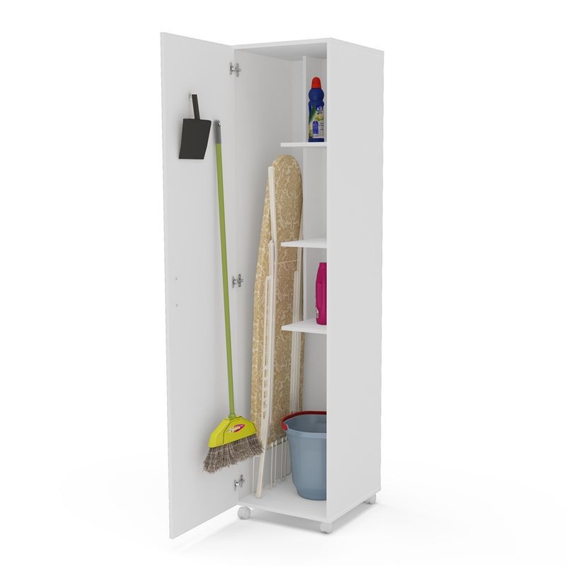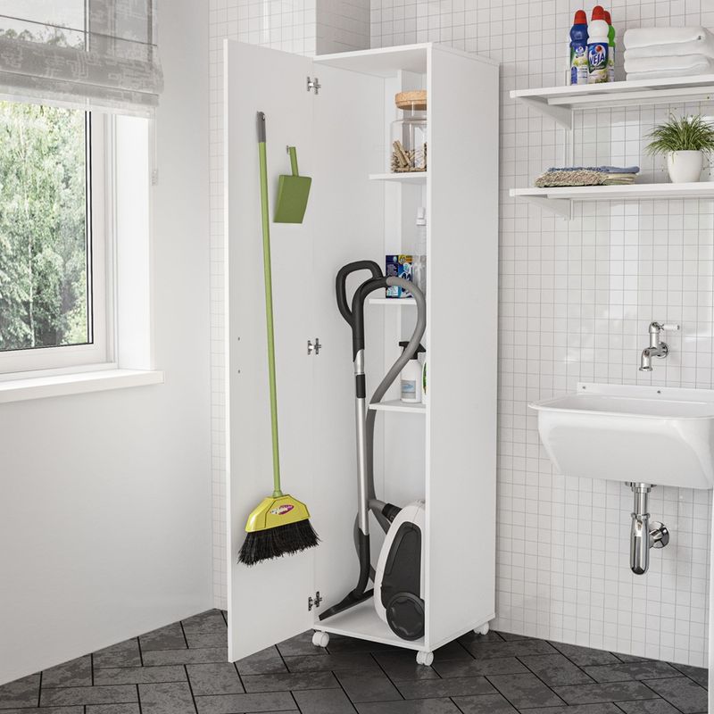 Mueble Politorno blanco multiusos para lavadero o cocina, con ruedas para facilitar la limpieza. Ideal para almacenar y organizar materiales de limpieza (escoba, pala) y otros productos de limpieza.
