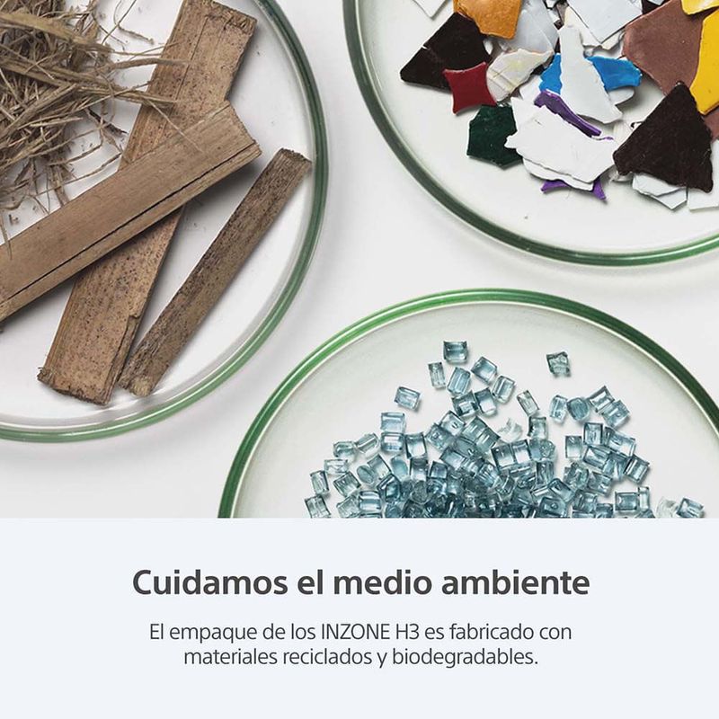 Nuestros productos no solo son elegantes, también protegen el medioambiente. El embalaje de los INZONE H3 no usa plástico, solo materiales reciclados y tela de celulosa no tejida. Esto refleja nuestro compromiso por reducir el impacto medioambiental de nuestros productos y prácticas.1