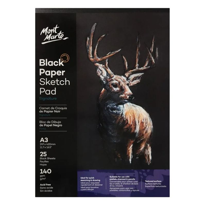 El Block de Papel Negro Mont Marte A3 es perfecto para resaltar tus creaciones artísticas con pasteles, lápices metálicos, gel blanco o carboncillo.