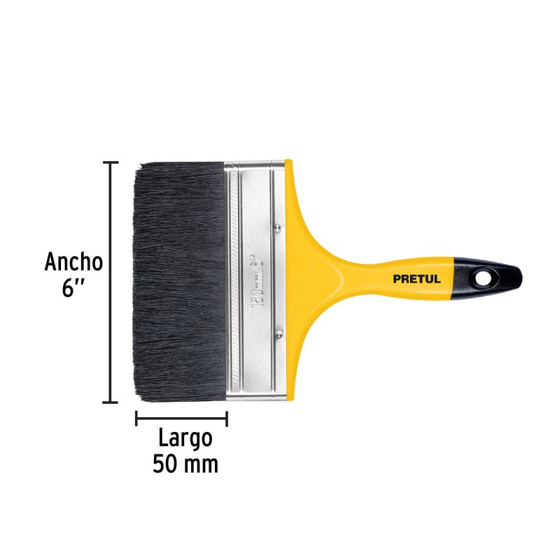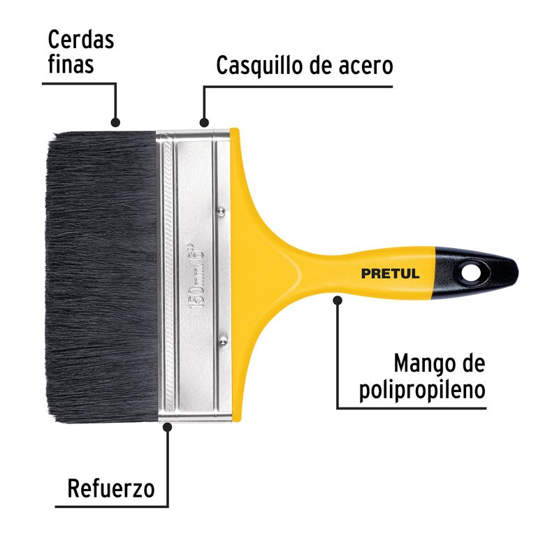 La Pretul BRP-6 es una brocha de gran tamaño diseñada para cubrir superficies extensas con rapidez y precisión. Gracias a su mezcla de cerdas naturales y sintéticas, ofrece una excelente retención de pintura y un acabado uniforme. Su mango de polipropileno es ergonómico, resistente a solventes y cómodo para el uso prolongado.