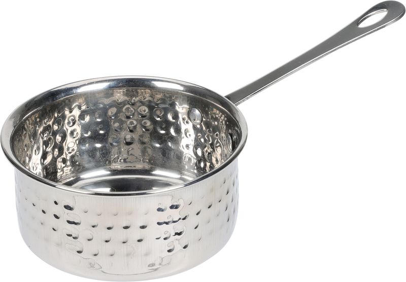 Cacerola de acero inoxidable, efecto martillado, diámetro 12x5cm, peso 170 gramos.