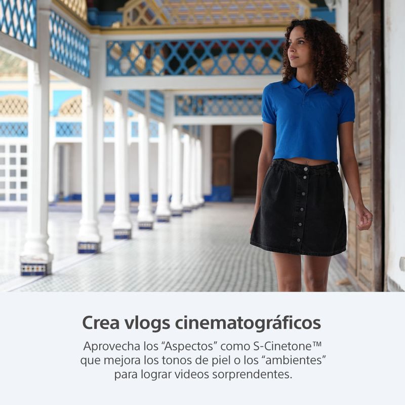 Configuración de vlog cinematográfico9 proporciona una forma intuitiva de crear secuencias de vlogs cinematográficos sin tener que lidiar con configuraciones complejas de la cámara. Al elegir una apariencia y una intención10 adecuados, cualquiera puede crear metraje de vlog cinematográfico que coincida idealmente con la escena y su intención creativa. La configuración cinematográfica de vlogs incluye opciones de “aspecto”, como S-Cinetone™, para realzar los tonos de la piel; opciones de “intención”11 para enfatizar colores específicos; y la velocidad de transición de EA para determinar la rapidez con la que el enfoque automático cambia de un sujeto a otro.