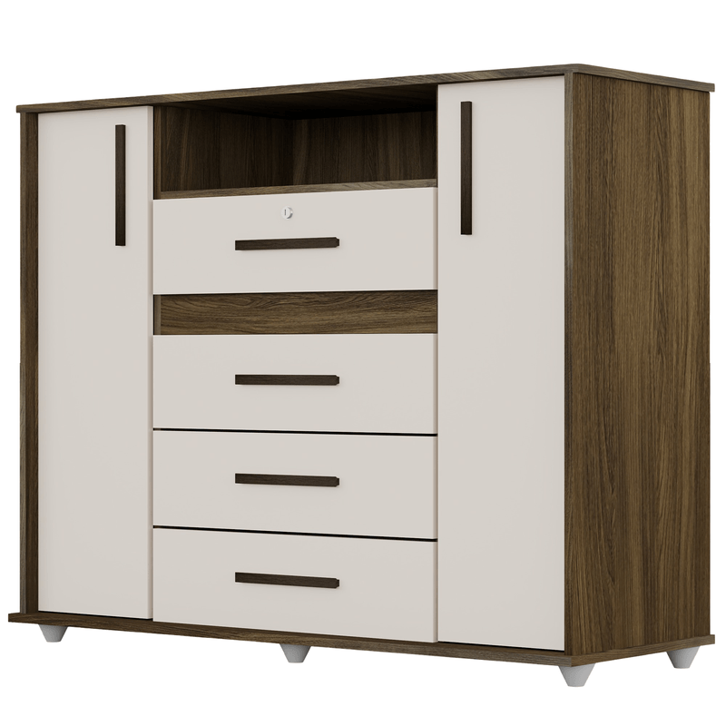 Práctica y elegante, ideal para mantener tu espacio organizado. Cuenta con 4 cajones y 2 puertas que ofrecen amplio almacenamiento, con un diseño moderno en tonos amendoia y blanco.