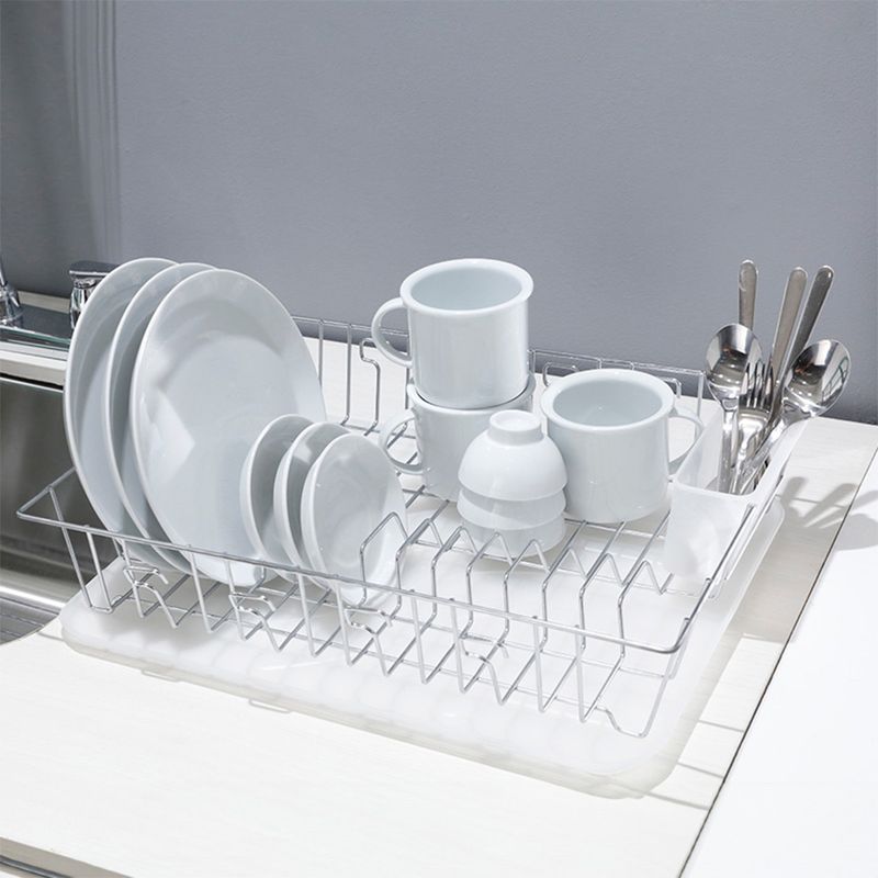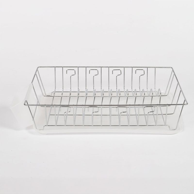 Escurridor de platos con marcos laterales en fleje elegante que le dan personalidad y un juego de tramas y barandas rectangulares que complementan su forma. Incluye bandeja negra y portavasos laterale