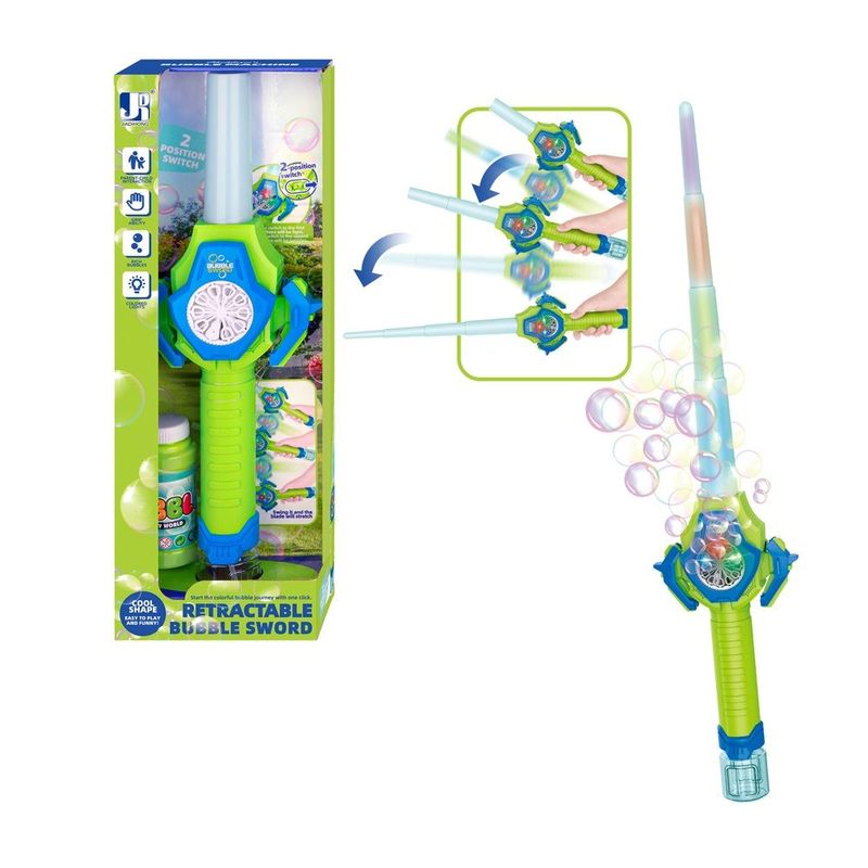 Juguete tipo espada que lanza burbujas al agitar. Ideal para juegos activos al aire libre y para estimular el movimiento.