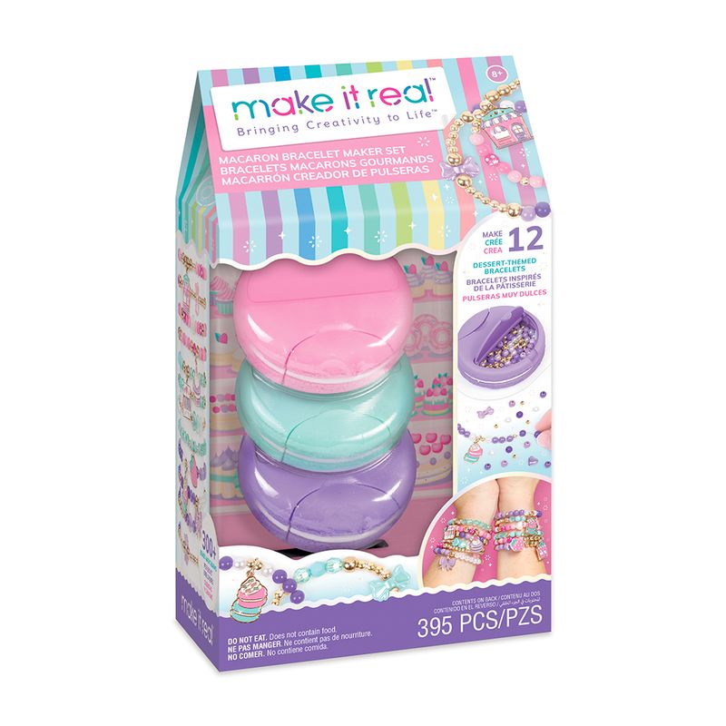 ¡Hemos hecho que hacer pulseras sea aún más dulce con 3 fabricantes de pulseras con forma de macarón! Cada macaron incluye todo lo necesario para hacer 4 pulseras, para un total de 12 accesorios de decoración. Tira y enrolla el cordón alrededor del perímetro del macaron para medir y cortar. Abre la vitrina y encontrarás amuletos y cuentas con temática de postre listos para adornar cada pulsera. ¡Lleva las adorables 12 pulseras o regala a tus amigos para compartir algo de dulzura! Guarda pulseras y materiales en los macarons entre sesiones de manualidades para divertirte sin desorden. Esto es una idea de regalo estupenda para jóvenes creativos, ya sea por una fiesta, un cumpleaños o simplemente porque sí. Da el regalo de la creatividad y la autoexpresión. Perfecto para niños de 8+ años.
