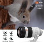 El modelo SEL100400GM es totalmente compatible con los teleobjetivos de alto rendimiento SEL14TC y SEL20TC, para aumentar la distancia focal 1,4 o 2 veces, respectivamente. Esto corresponde a una distancia focal máxima de 800 mm (1200 mm en un cuerpo con formato APS-C).1
