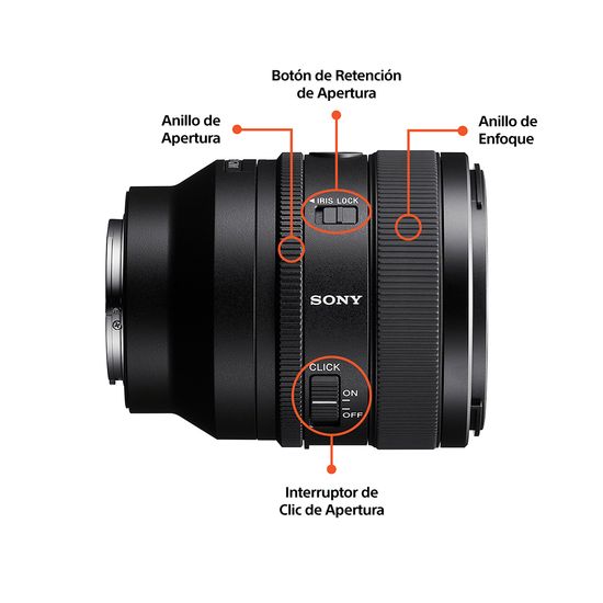 Un anillo de apertura con un conmutador de encendido/apagado de topes de clic ofrece un control de apertura directo y práctico. El conmutador de bloqueo de iris se puede bloquear para que el anillo de apertura quede fijo en la posición A, o bien se puede configurar manualmente de F1,4 a F16. Cuando está desbloqueado, el anillo de apertura puede alternar entre todos los ajustes.