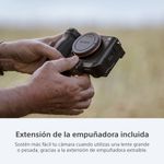 Una extensión de empuñadura incluida proporciona un agarre aún mejor para la máxima comodidad y una mínima fatiga durante largas sesiones de captura o grabación, incluso con lentes pesados de gran apertura o teleobjetivos. La extensión de la empuñadura no interfiere en el reemplazo de la batería ni el montaje en trípode. La extensión de la empuñadura se puede dejar desactivada para capturar o grabar normalmente y, luego, acoplarse a fin de mejorar el manejo cuando se debe usar un lente grande durante un período prolongado.