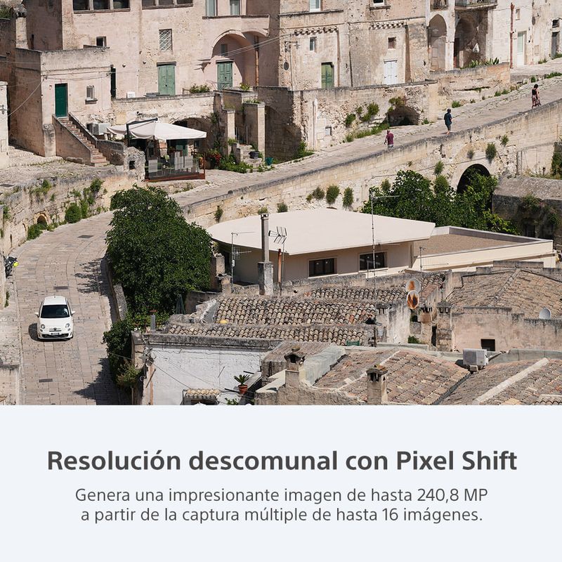 La captura múltiple con Pixel Shift usa el sistema de estabilización de imagen integrada de precisión para capturar múltiples imágenes con desplazamiento de píxeles que después se combinarán en una PC a fin de lograr una resolución impresionante en una sola imagen. Se pueden producir composiciones de 16 imágenes con aproximadamente 240,8 millones de píxeles (19.008 x 12.672 píxeles)10 a partir de datos equivalentes a unos 963,2 millones de píxeles.