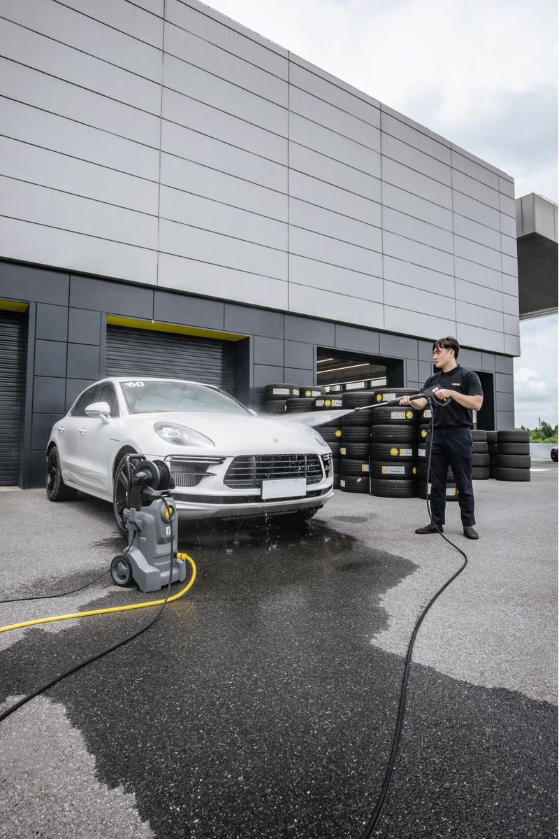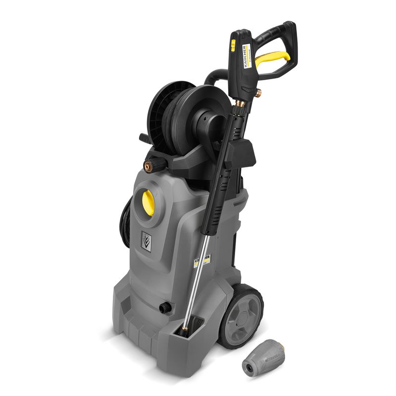 Limpiadora de alta presión Compact HD 4/10 X Classic con descarga automática de presión y enrollador de mangueras integrado. Muy ergonómico y móvil gracias al tirador retráctil y las ruedas robustas.