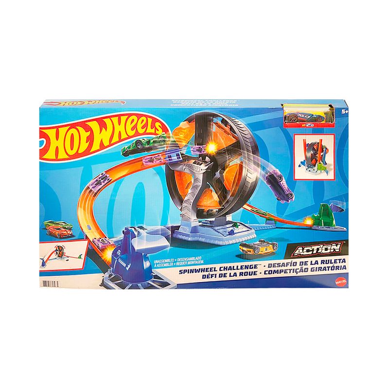 Prepárate para vivir emociones al límite con la Pista Hot Wheels “Giros Extremos: Desafío de la Ruleta”. Este set trae toda la adrenalina del racing extremo, donde los coches Hot Wheels se lanzan a toda velocidad para atravesar un loop pronunciado, subir por rampas desafiantes y culminar su recorrido en una rueda giratoria con alas móviles. Cada giro y cada choque prometen una experiencia dinámica que mantendrá a los pequeños compitiendo una y otra vez.