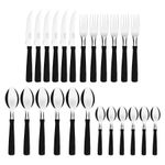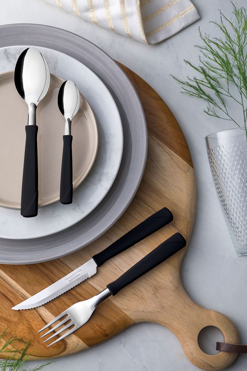 Las láminas tienen mayor durabilidad del filo debido al tratamiento térmico. El juego tiene tenedores, cucharas y cuchillos con láminas de acero inoxidable y mangos de polipropileno que propician mejor manejo