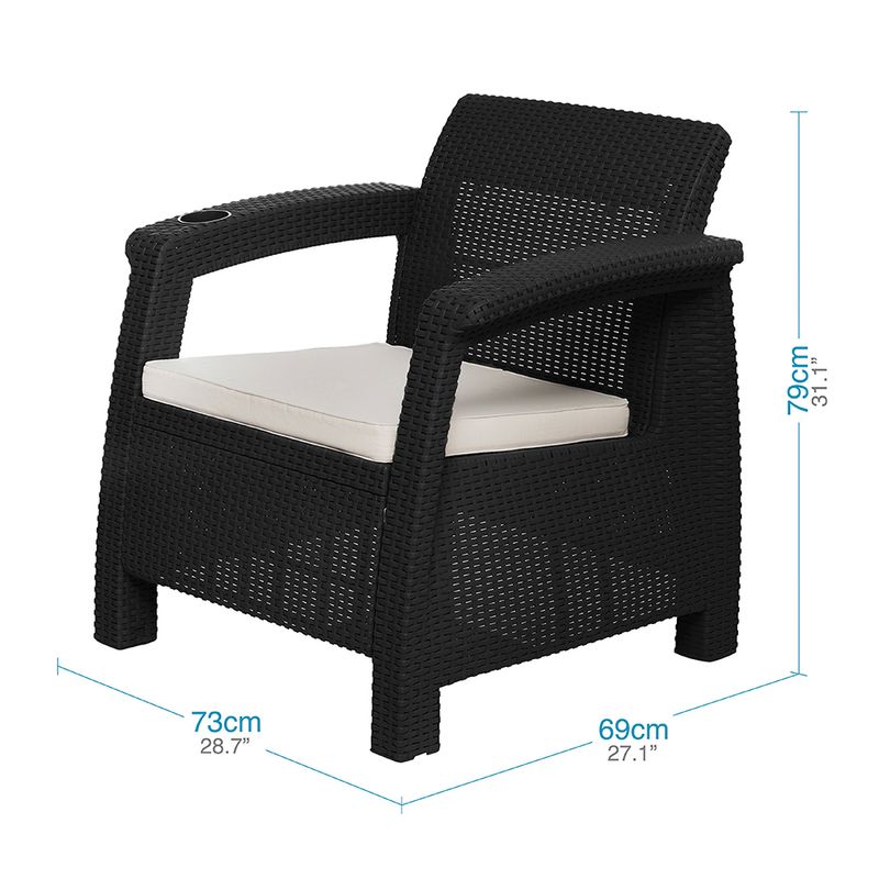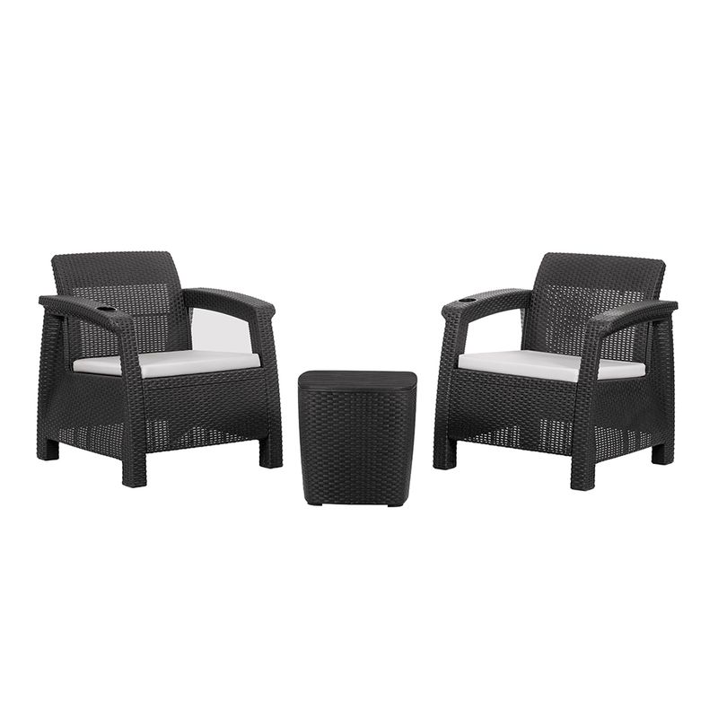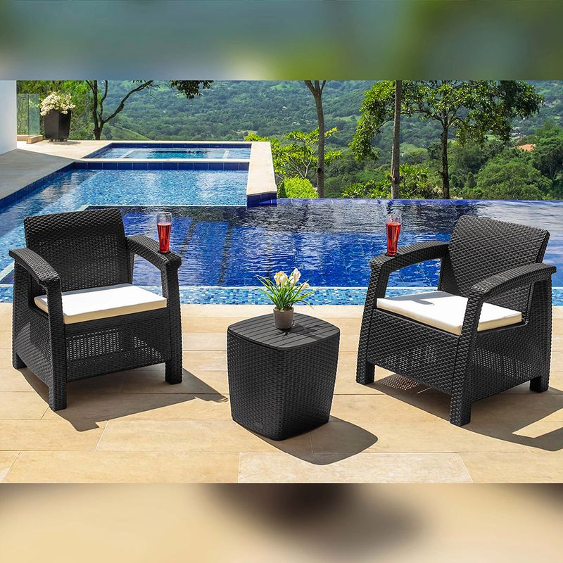 Perfecto para realzar cualquier espacio. Ya sea en interiores o exteriores, esta sala te brinda el máximo confort con sus dos puestos y su mesa tipo baúl.