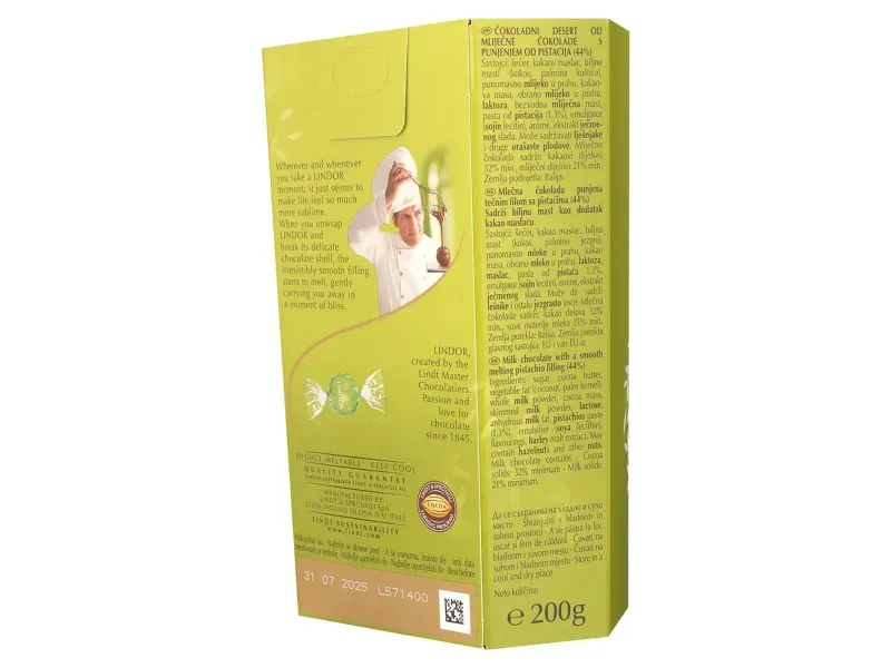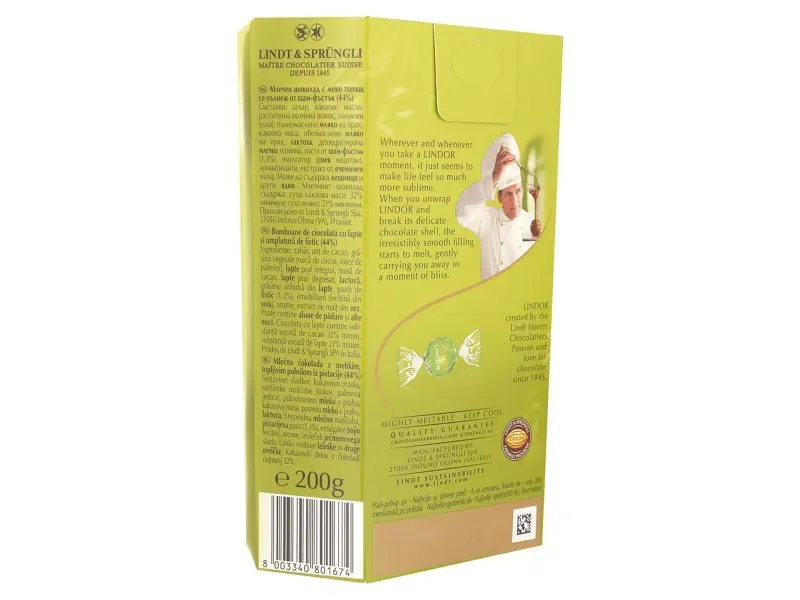 Déjate seducir por la irresistible suavidad de los Bombones Lindt Lindor con Relleno de Pistacho. Este paquete de 200 gramos contiene los icónicos bombones Lindor, conocidos por su cáscara de chocolate que encierra un corazón de relleno cremoso que se derrite suavemente en tu boca. En esta deliciosa variedad, el chocolate se combina con un exquisito y aromático relleno sabor a pistacho, creando una experiencia gustativa única y sofisticada.