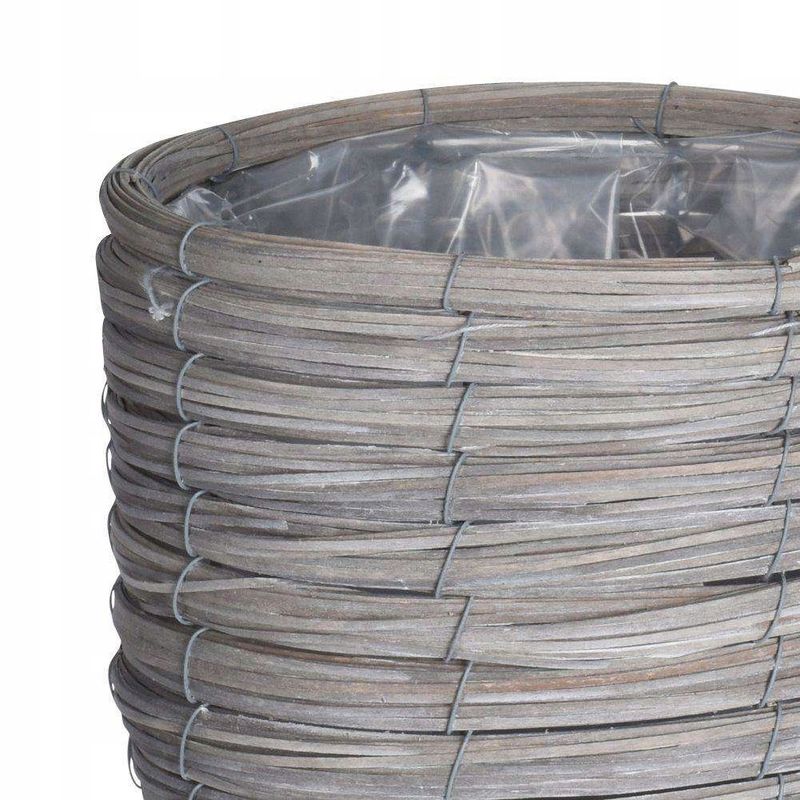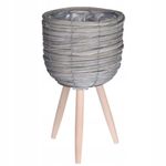 Diseño vanguardista: Cesto tejido en tonos grises, cuidadosamente elaborado, que descansa sobre tres patas robustas de madera clara. El contraste visual aporta elegancia y garantiza estabilidad.