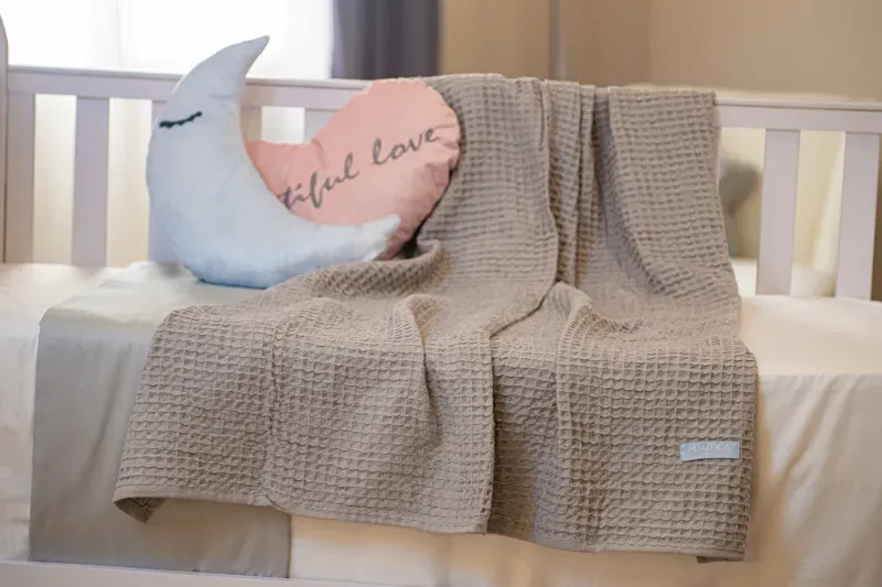 El tejido tipo waffle, caracterizado por su textura ligera y acogedora, proporciona un tacto agradable que transmite bienestar. El tono gris claro aporta un aire de calma y sofisticación, siendo fácilmente combinable con otros elementos decorativos del entorno. Más allá de su función como abrigo, esta manta representa una pieza esencial en el cuidado diario del bebé.