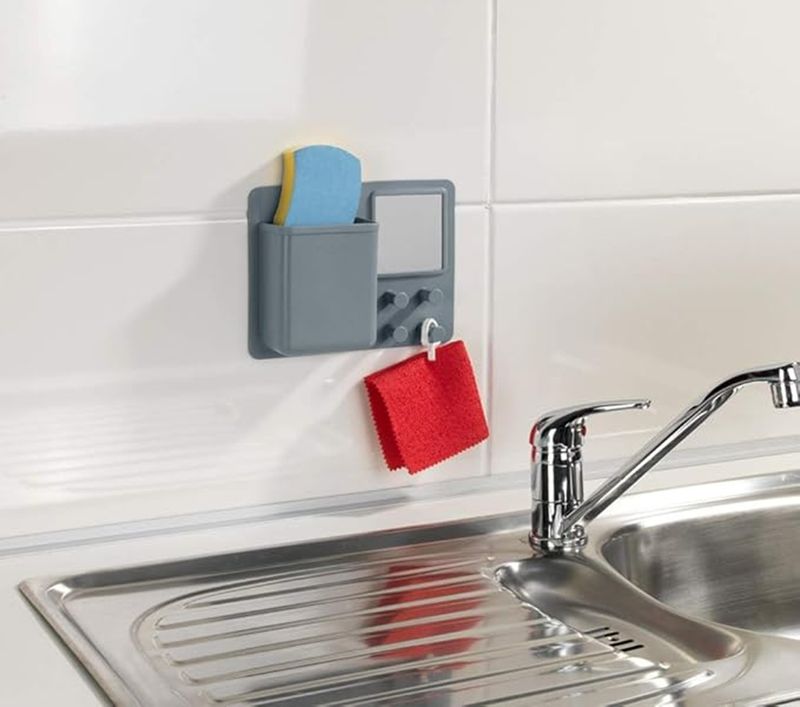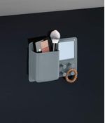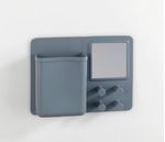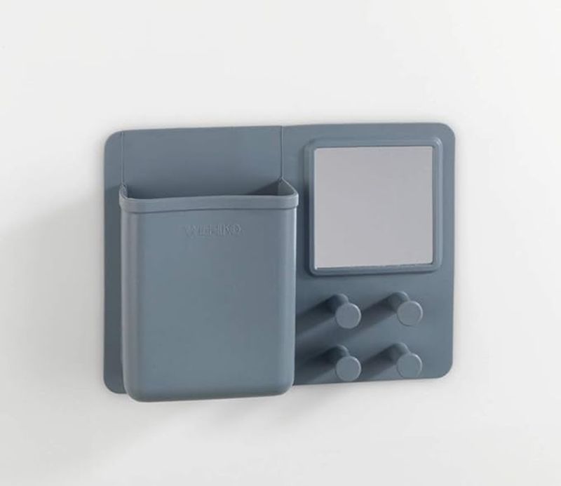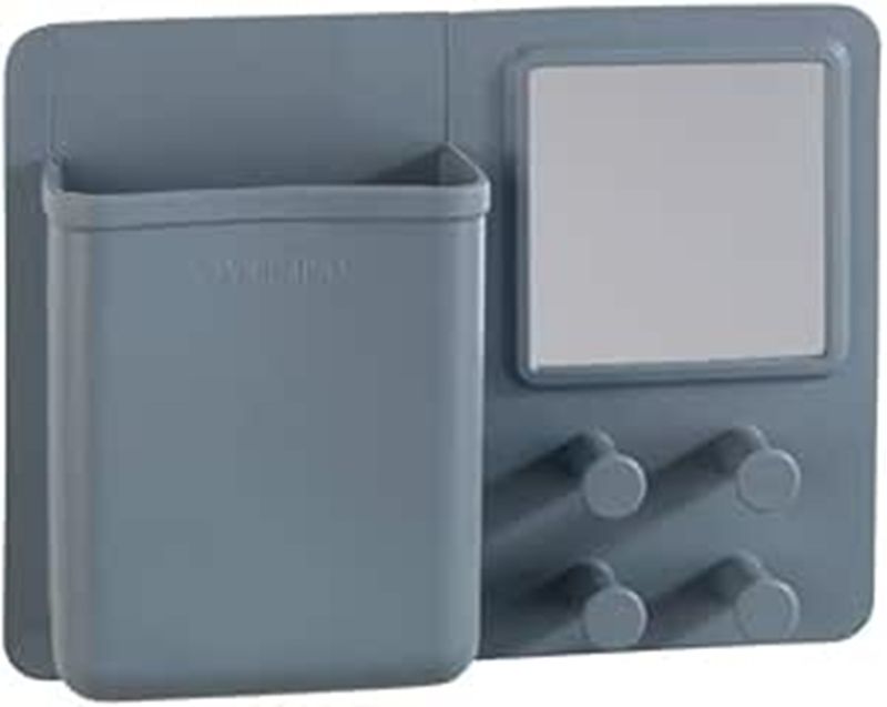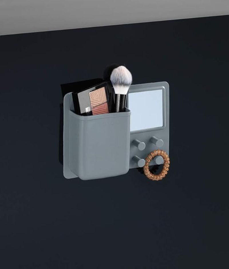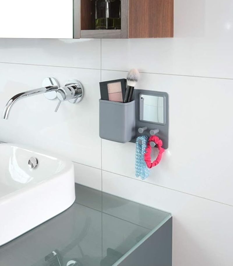 Organizador de pared multifuncional con espejo y ganchos en tono gris azulado, diseñado para mantener cualquier espacio limpio, organizado y estéticamente agradable. Su diseño compacto y elegante permite almacenar objetos esenciales como cepillos de dientes, controles remotos, utensilios o papelería, mientras que sus ganchos integrados facilitan colgar llaves, toallas pequeñas, cables u otros accesorios. Fabricado con un polímero resistente y duradero, garantiza un uso prolongado y una limpieza sencilla. Su sistema de fijación adhesiva asegura una instalación sin complicaciones, protegiendo las paredes y ofreciendo reubicación sin residuos. Ideal para baños, cocinas, oficinas o entradas, este organizador combina funcionalidad, ahorro de espacio y estilo minimalista.