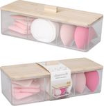 Organizador de maquillaje con juego de esponjas y compresas cotten, ps con tapa de bambú (bambusoideae), tamaño: 234x96xh80mm, incluyendo: 3 beauty blenders en forma de gota de agua, 4 yemas para los dedos y 35 almohadillas de algodón, peso total: 363 gramos, en 4 colores rosas diferentes, empaquetado en nuestra funda de diseño accetate