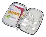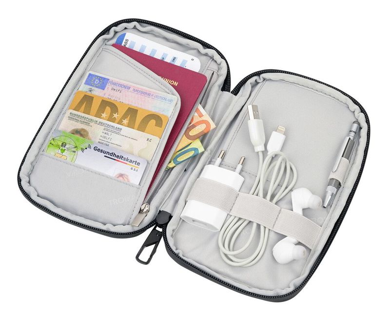 Viajero inteligente y cables inteligente, compartimento frontal abierto para smartphone, pasaporte o tarjeta de embarque, compartimento cerrado con cremallera para dinero en efectivo, recibos, cuatro ranuras para tarjetas, compartimento grande para pasaporte, compartimento ampliable para auriculares inalámbricos, tres bandas elásticas para organizar los cables de carga.