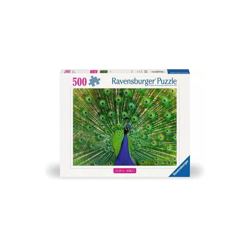 Contenido: 1 rompecabezas de 500 piezas. Diseño: Imagen detallada de un pavo real con su cola desplegada. Edad recomendada: 10 años en adelante. Beneficios: Mejora la memoria visual, la coordinación y la atención.