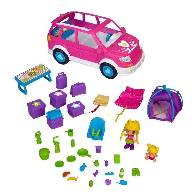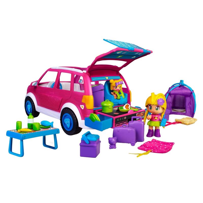 El set incluye un coche familiar de camping totalmente equipado con remolque desmontable, espacio interior para muñecos, y compartimentos funcionales. Además, viene con una muñeca Pinypon junto a su Pinypon Baby y más de 20 accesorios, como maletas, alimentos, utensilios de cocina, sillas plegables, parrilla, fogata y hasta una tienda de campaña. Todo ha sido diseñado con atención al detalle, permitiendo que los niños monten su propio campamento y disfruten de un sinfín de historias llenas de creatividad. Las piezas son compatibles con otros sets de Pinypon, lo que multiplica las posibilidades de juego.