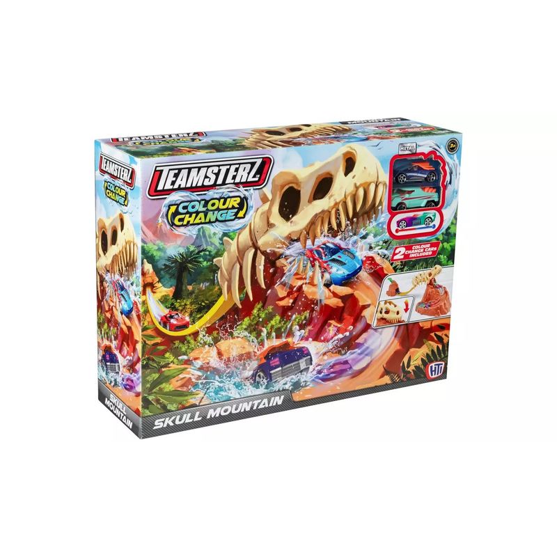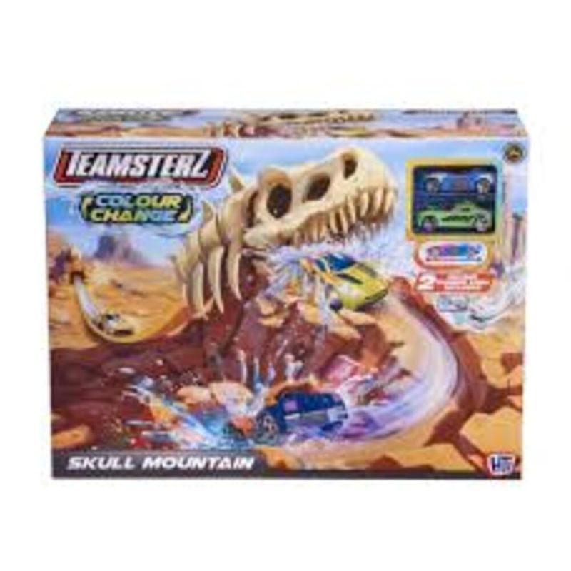Set de pista Montana Calavera Teamsterz con 2 autos incluidos. Ofrece rampas, obstáculos y diversión extrema para carreras emocionantes.