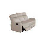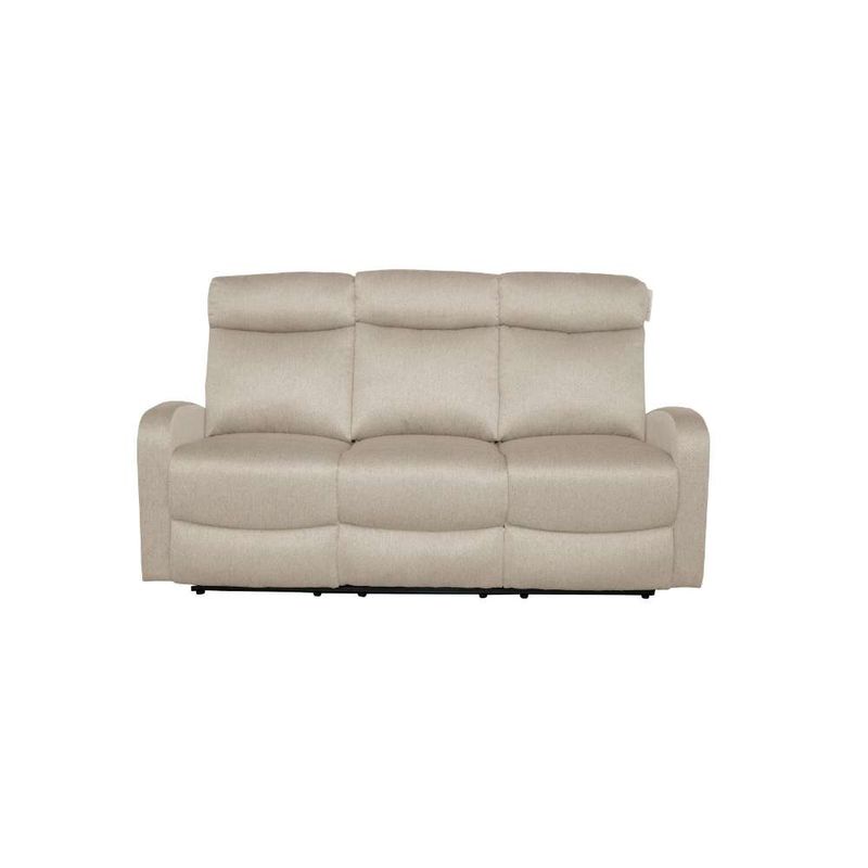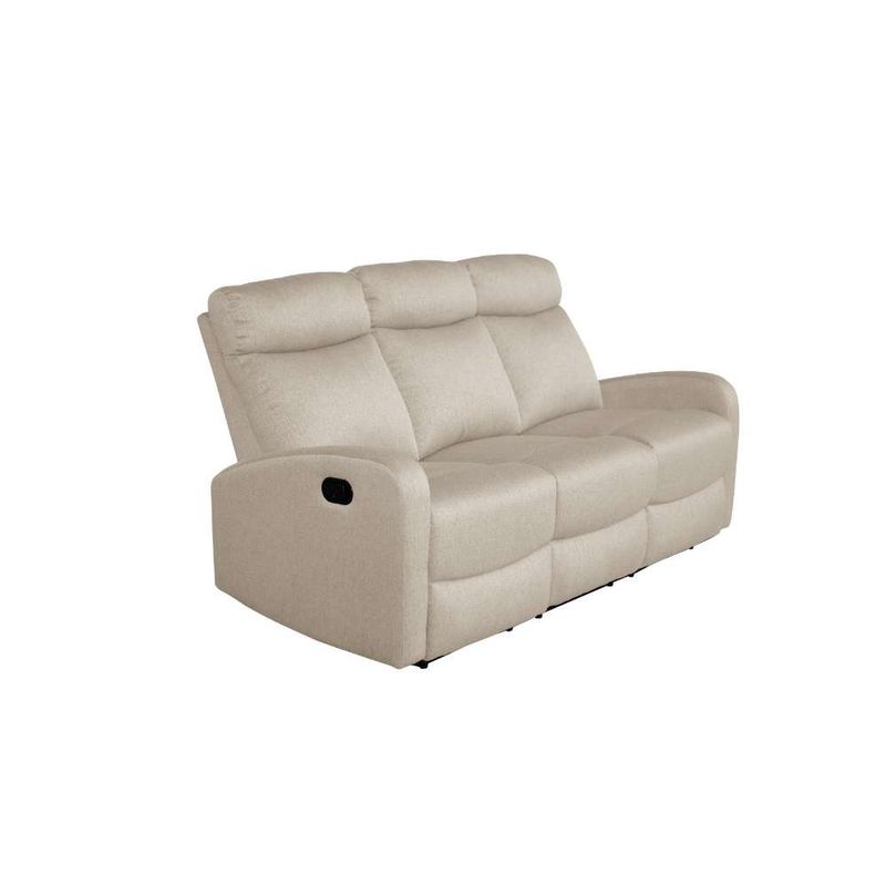 Sofá reclinable 3pts tela taupe Sandoval • Sofá de tres plazas con 2 reclinables manuales • Material: tela de poliéster, espuma, estructura de contrachapado, muelles ensacados. • Capacidad de peso: 330 kg.