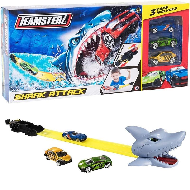 Lanzador Ataque Tiburón Teamsterz con 3 autos incluidos. Acción intensa y lanzamientos rápidos para carreras extremas.