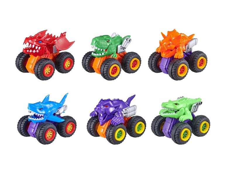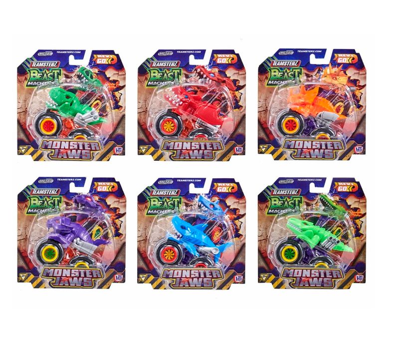 ¡Empieza la acción con los impresionantes camiones Teamsterz Beast Machines Monster Jaws! Estos vehículos a fricción están listos para competir, chocar y morder, gracias a su innovador sistema que activa sus mandíbulas al avanzar. Solo retrocede un poco el camión, suéltalo y observa cómo cobra vida con su feroz energía.